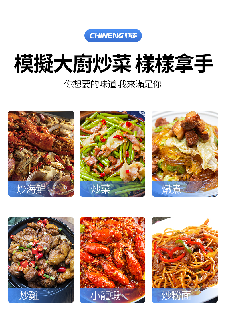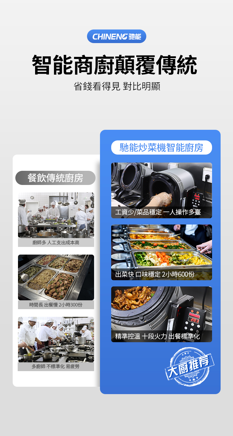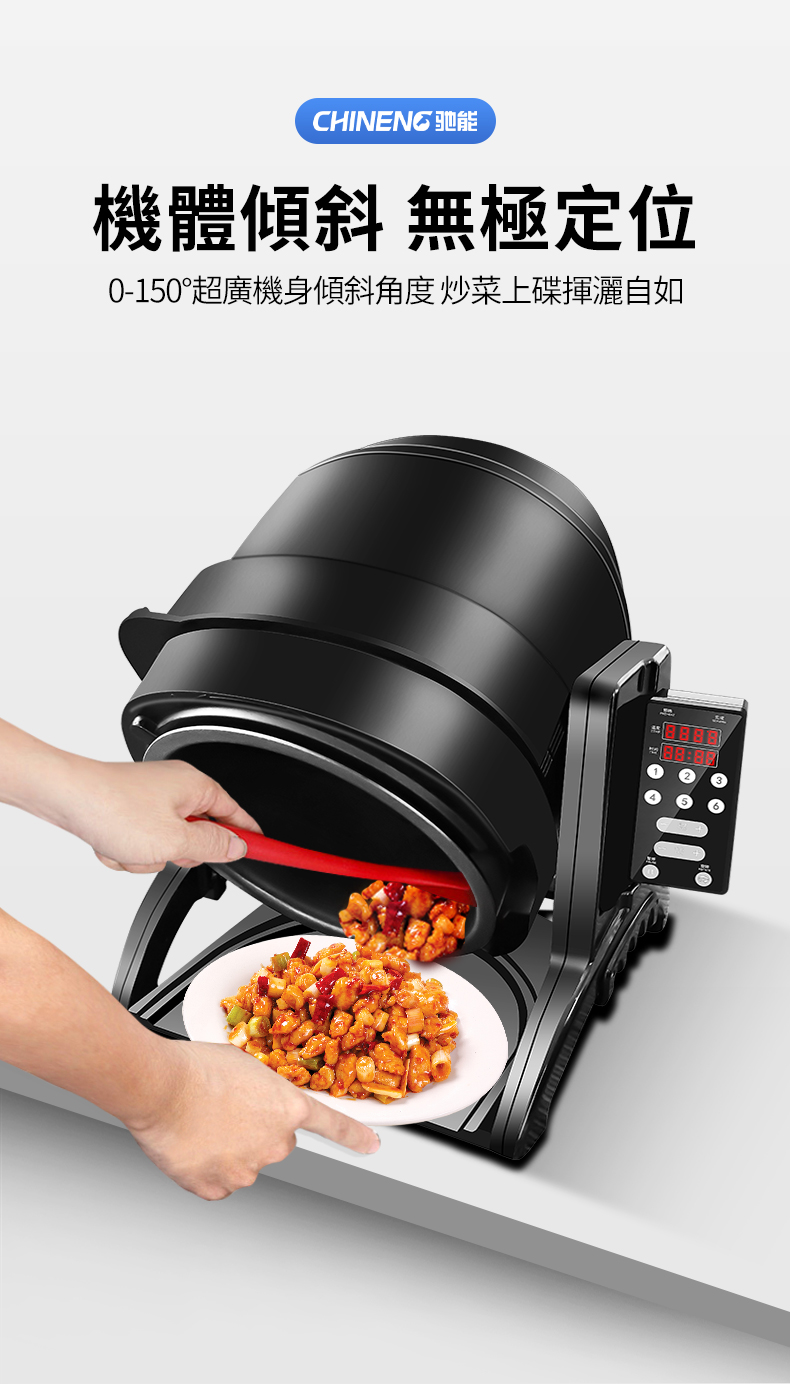 全自动化炒菜功能:馳能家商兩用炒菜機具備智能化的翻炒、火力與時間控制功能,能夠精準調控烹飪過程,確保每道菜品的口味穩定。其獨特的360度翻炒技術,可以模擬人工炒菜的手法,避免食材焦糊或不均勻加熱的問題,提高菜品的品質。