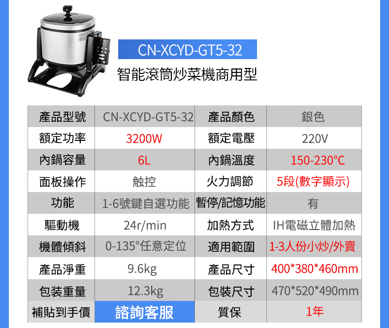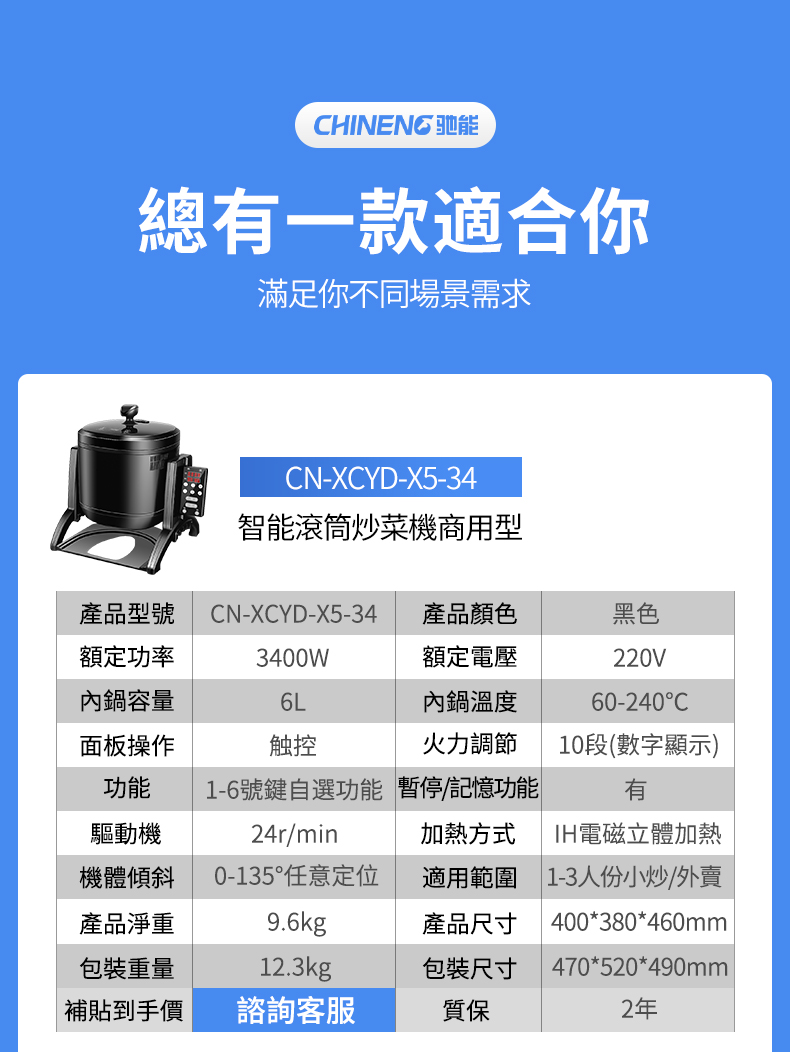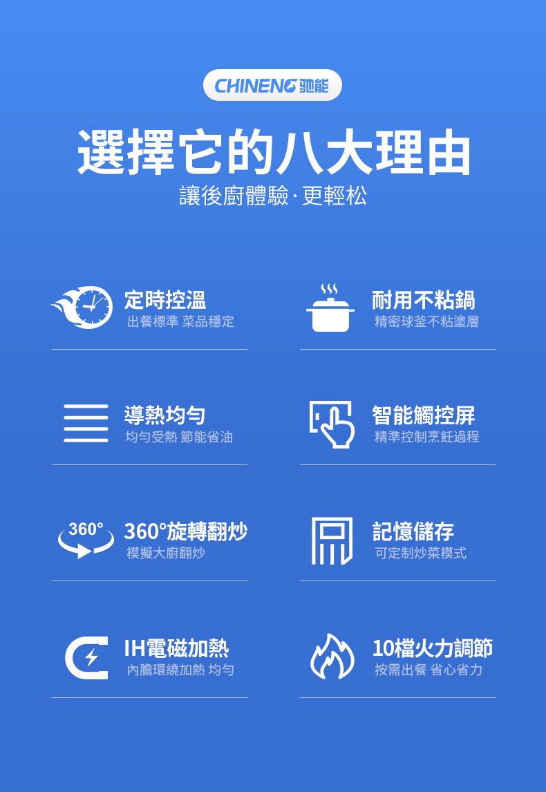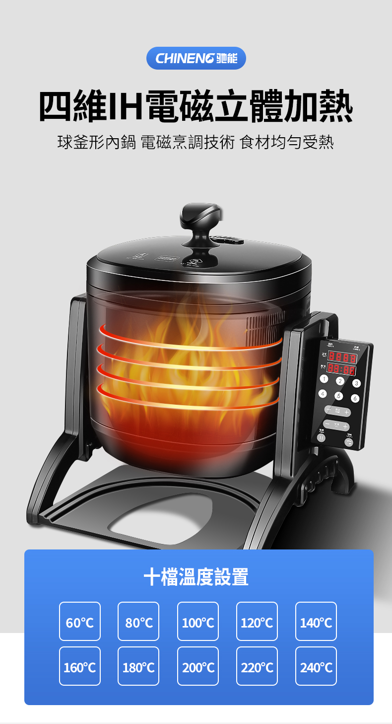 全自动化炒菜功能:馳能家商兩用炒菜機具備智能化的翻炒、火力與時間控制功能,能夠精準調控烹飪過程,確保每道菜品的口味穩定。其獨特的360度翻炒技術,可以模擬人工炒菜的手法,避免食材焦糊或不均勻加熱的問題,提高菜品的品質。