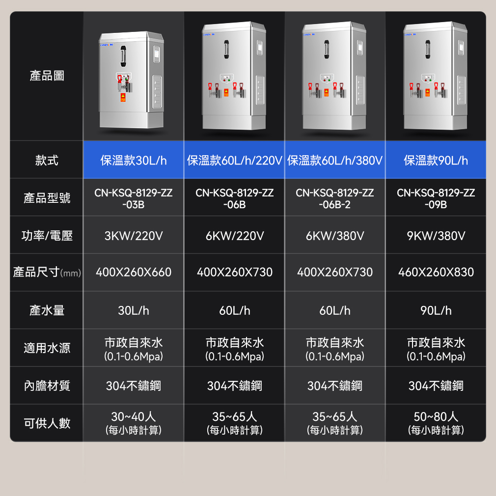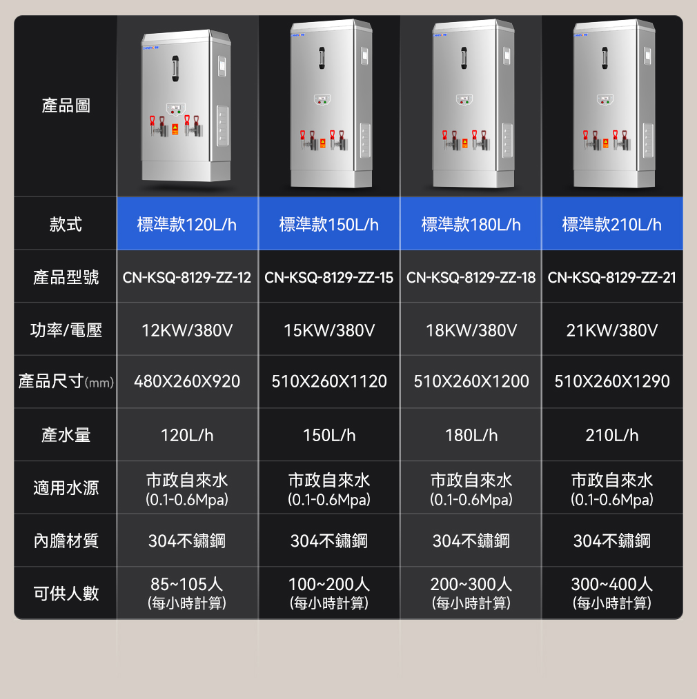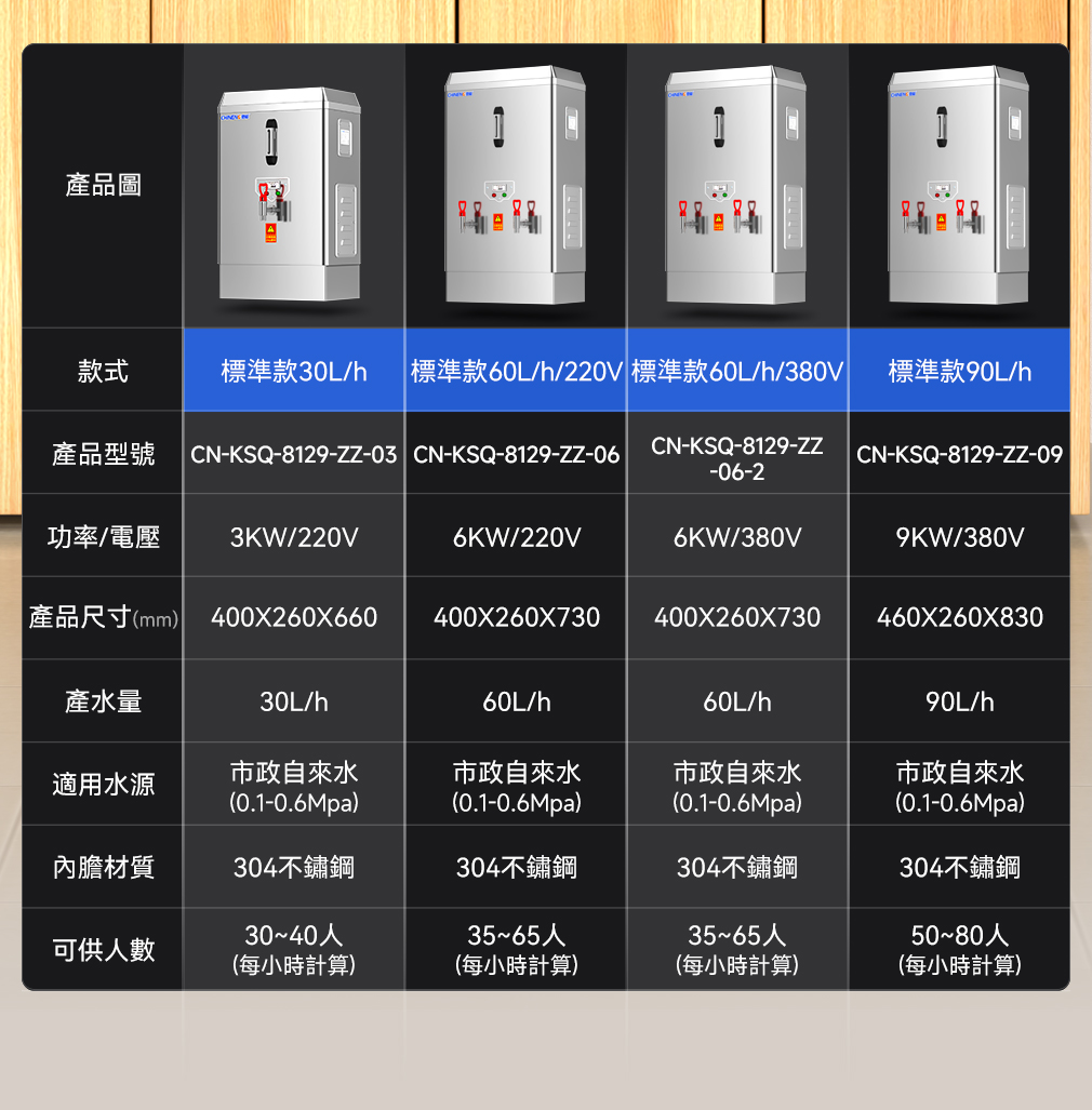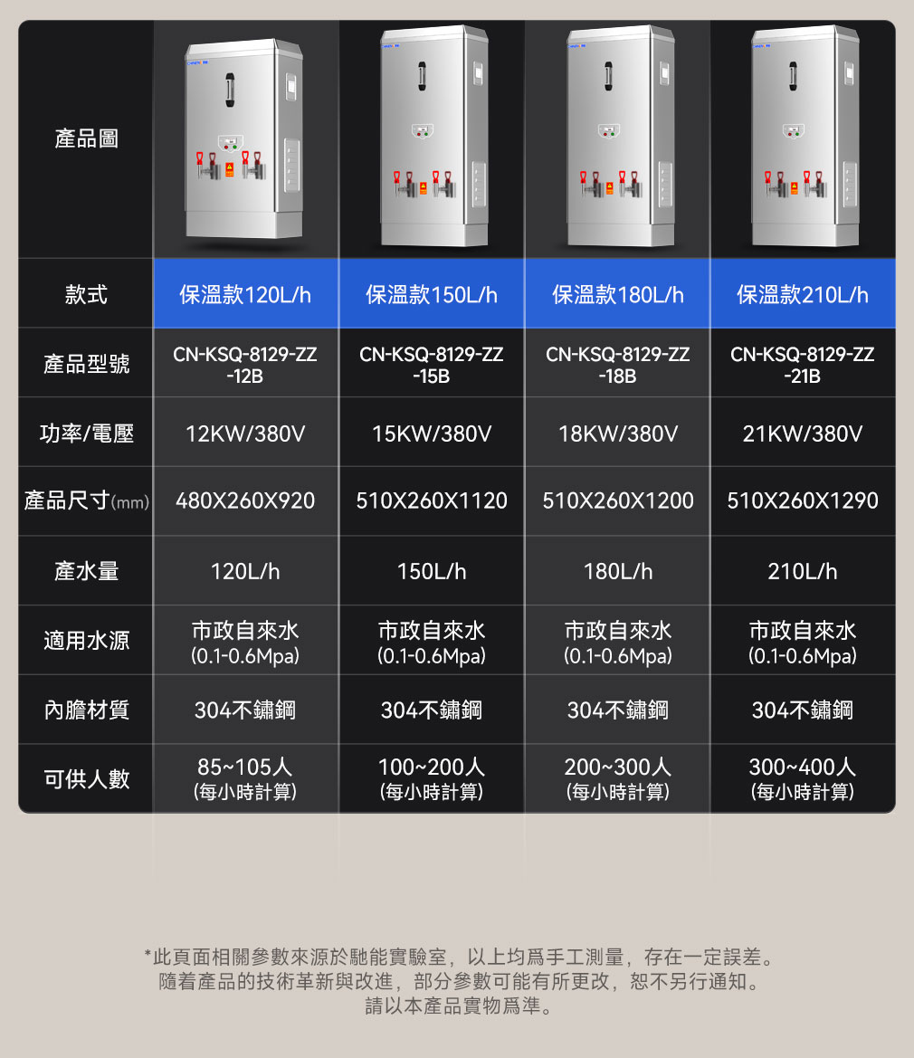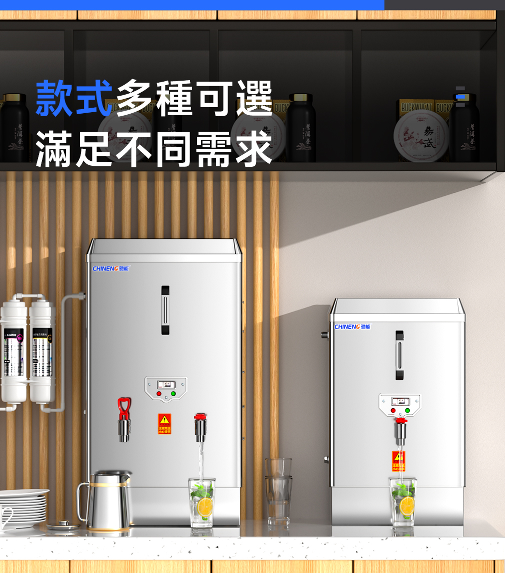 大容量設計:馳能商用開水器提供多種容量選擇,如30L、60L、90L、120L、150L、180L、210L等,滿足不同場所的用水需求。