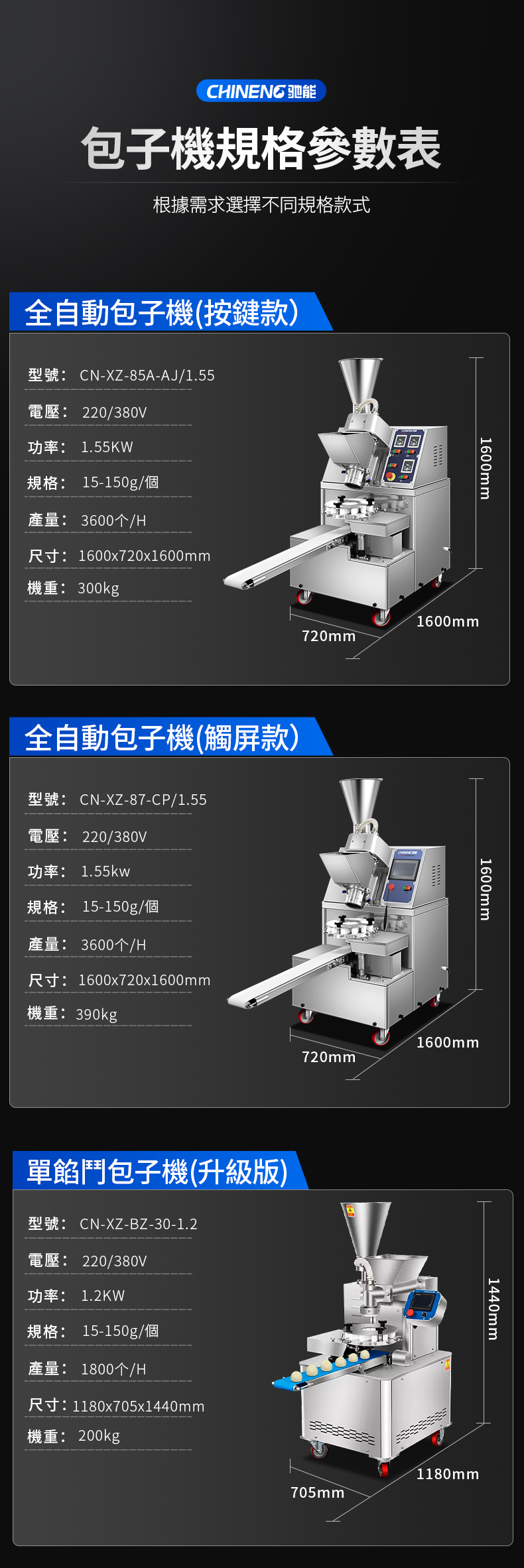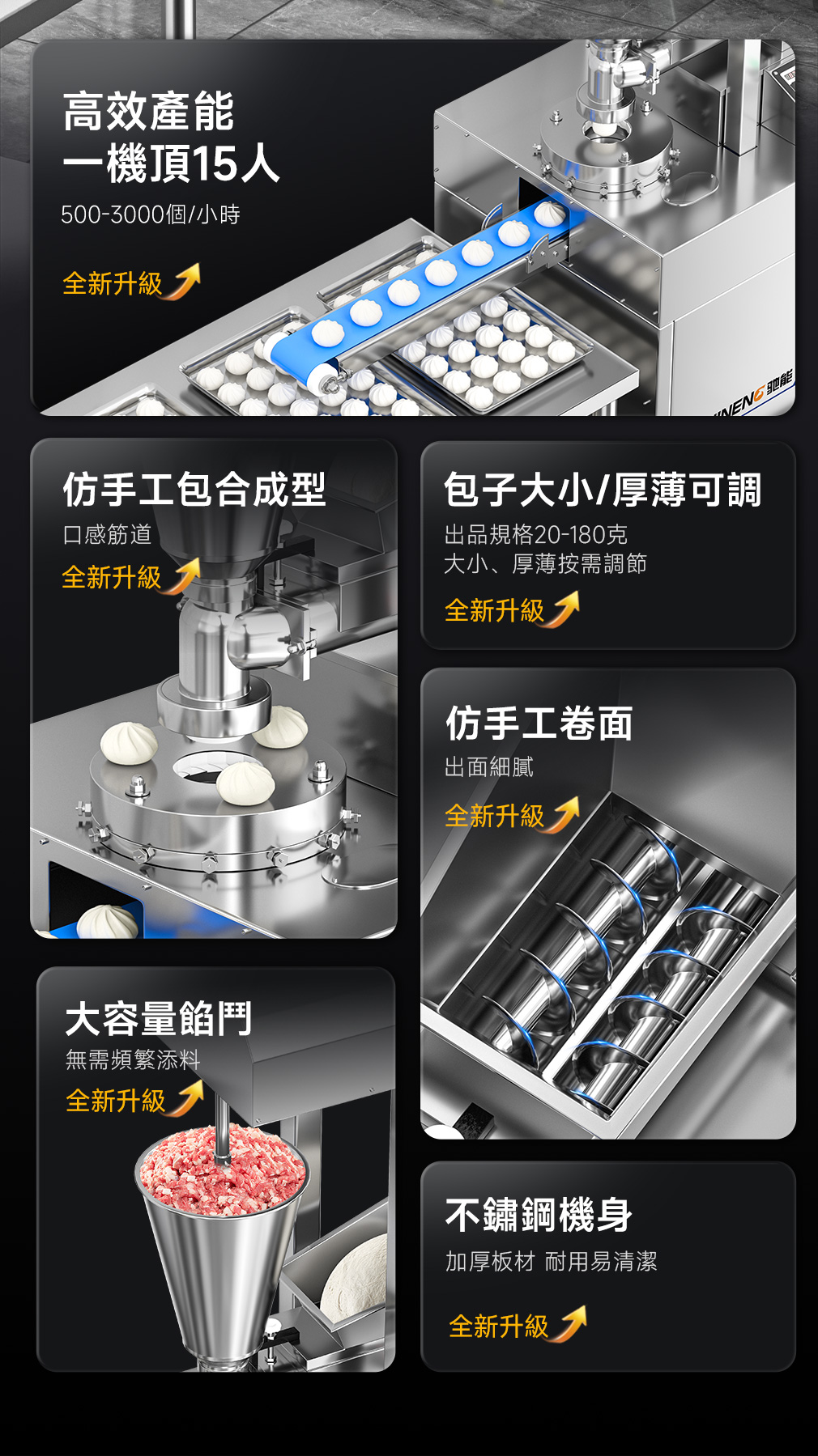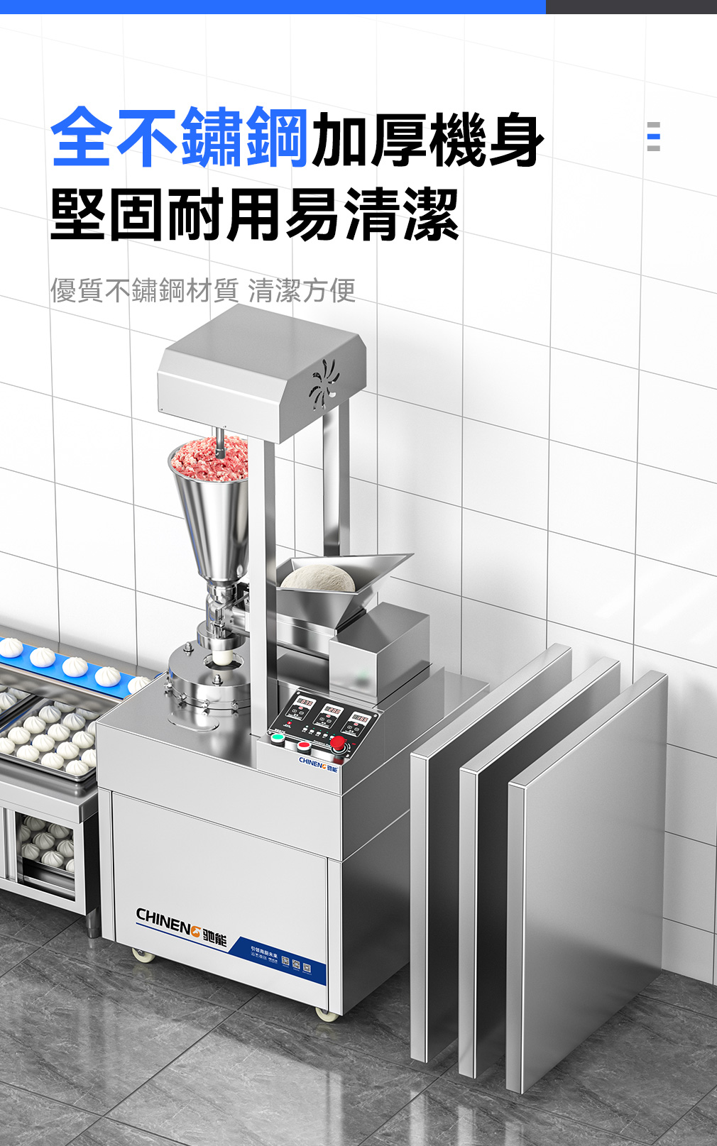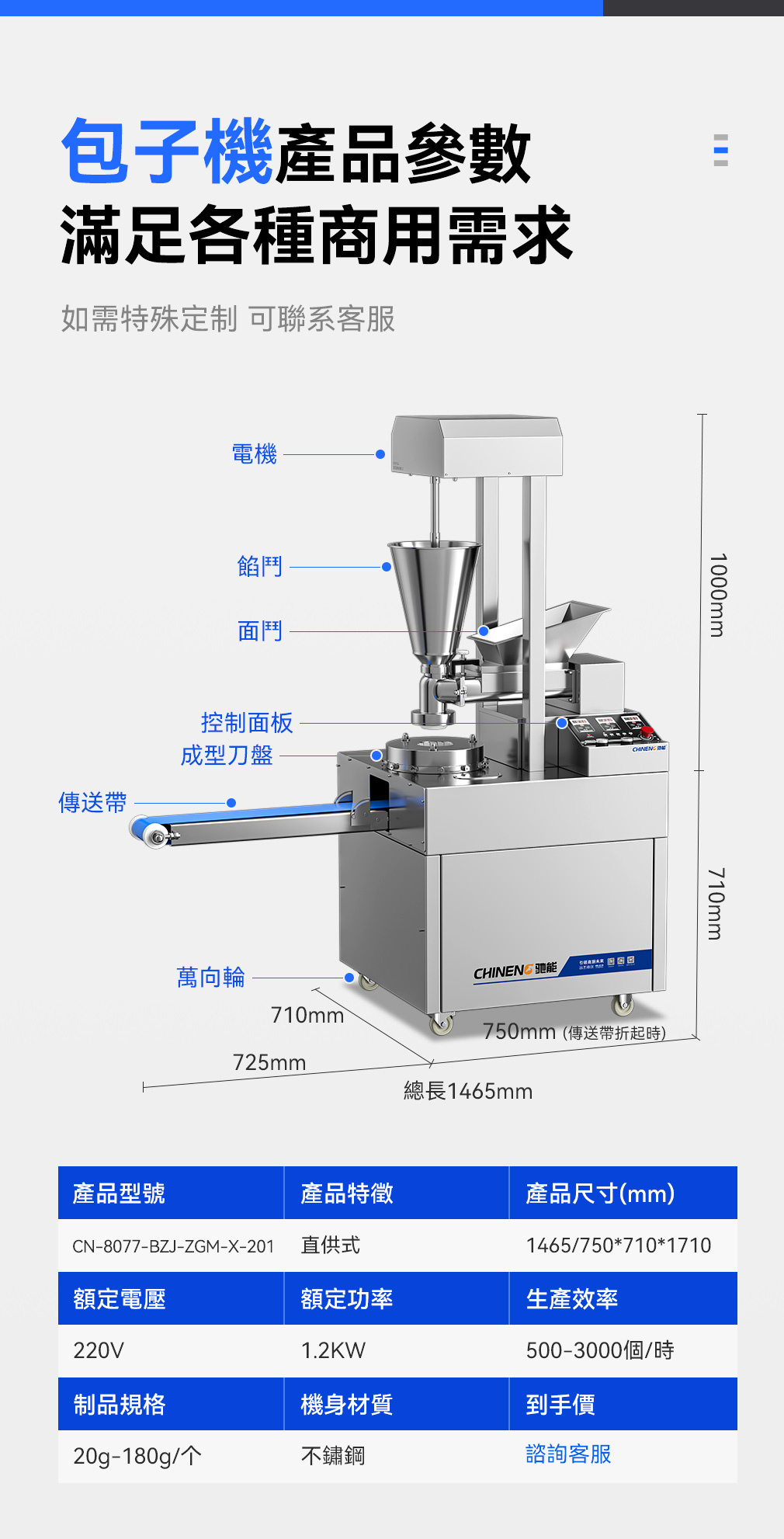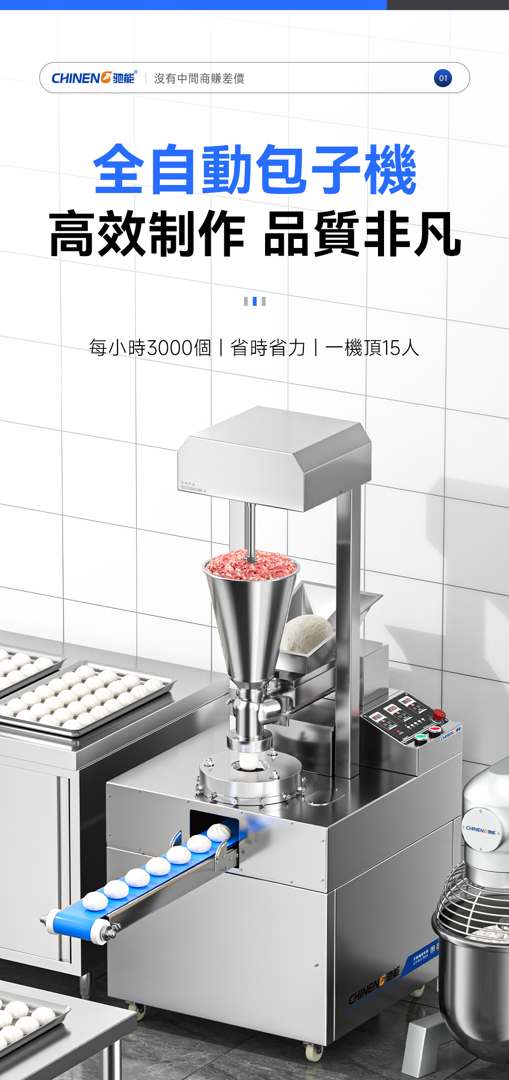 馳能包子機專爲包子店、酒店、學校、部隊、事業單位、工廠等餐飲食堂設計,旨在提高包子生產效率,節約人力成本。該機器採用不鏽鋼機身和純銅電機,確保耐用性和穩定性。同時,馳能包子機還支持定制,滿足不同客戶的特殊需求。