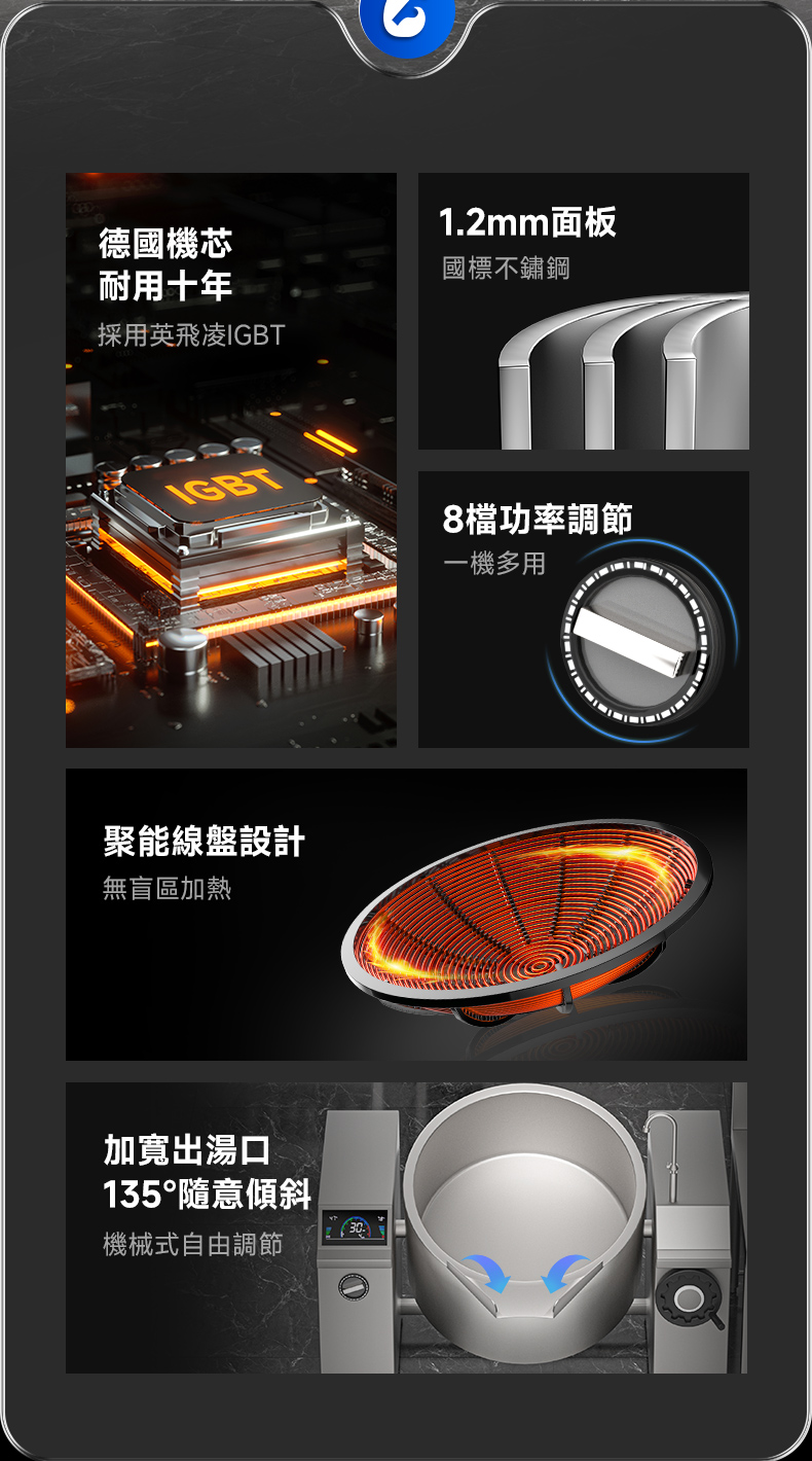 高效加熱:採用電磁感應加熱技術,具有加熱速度快、熱效率高的特點,能夠快速烹飪出美味佳餚。