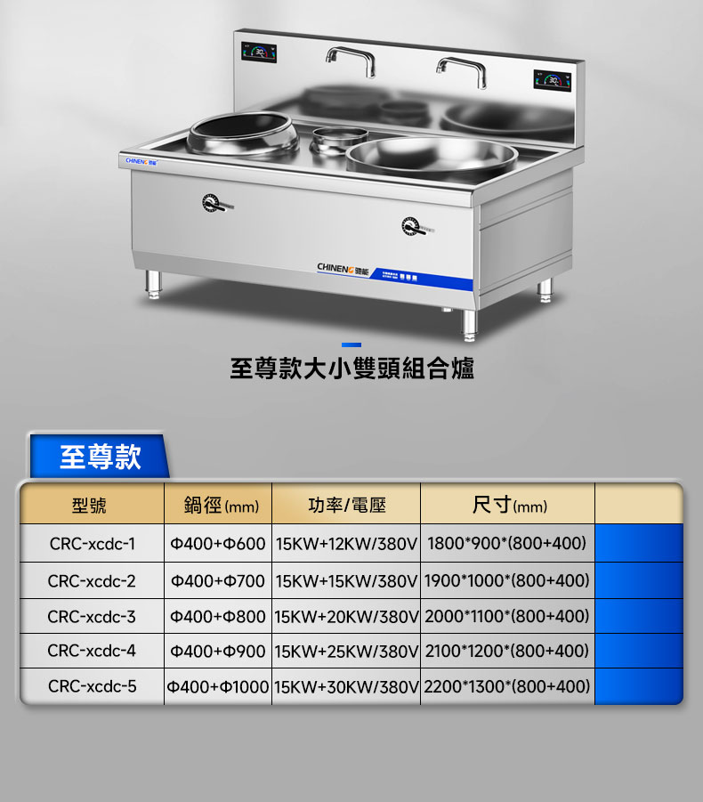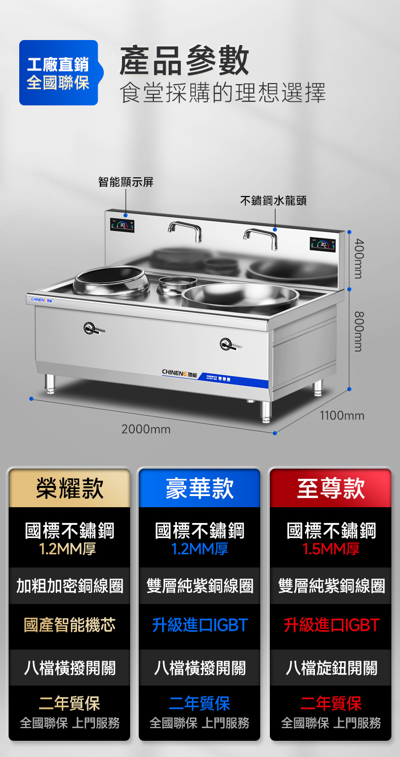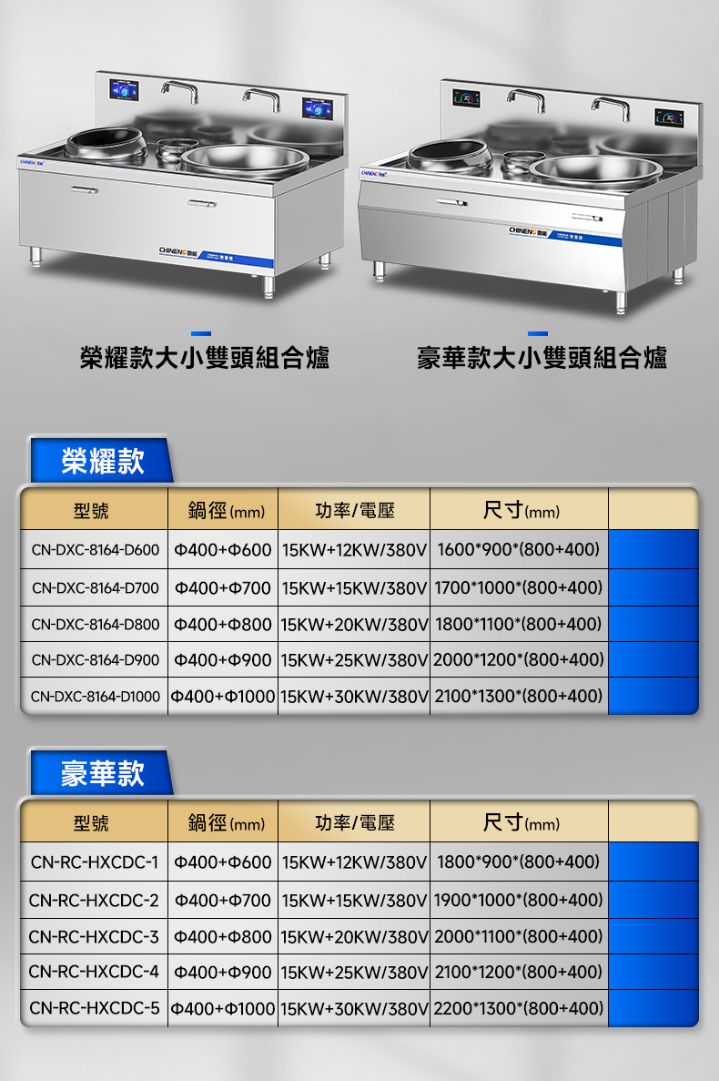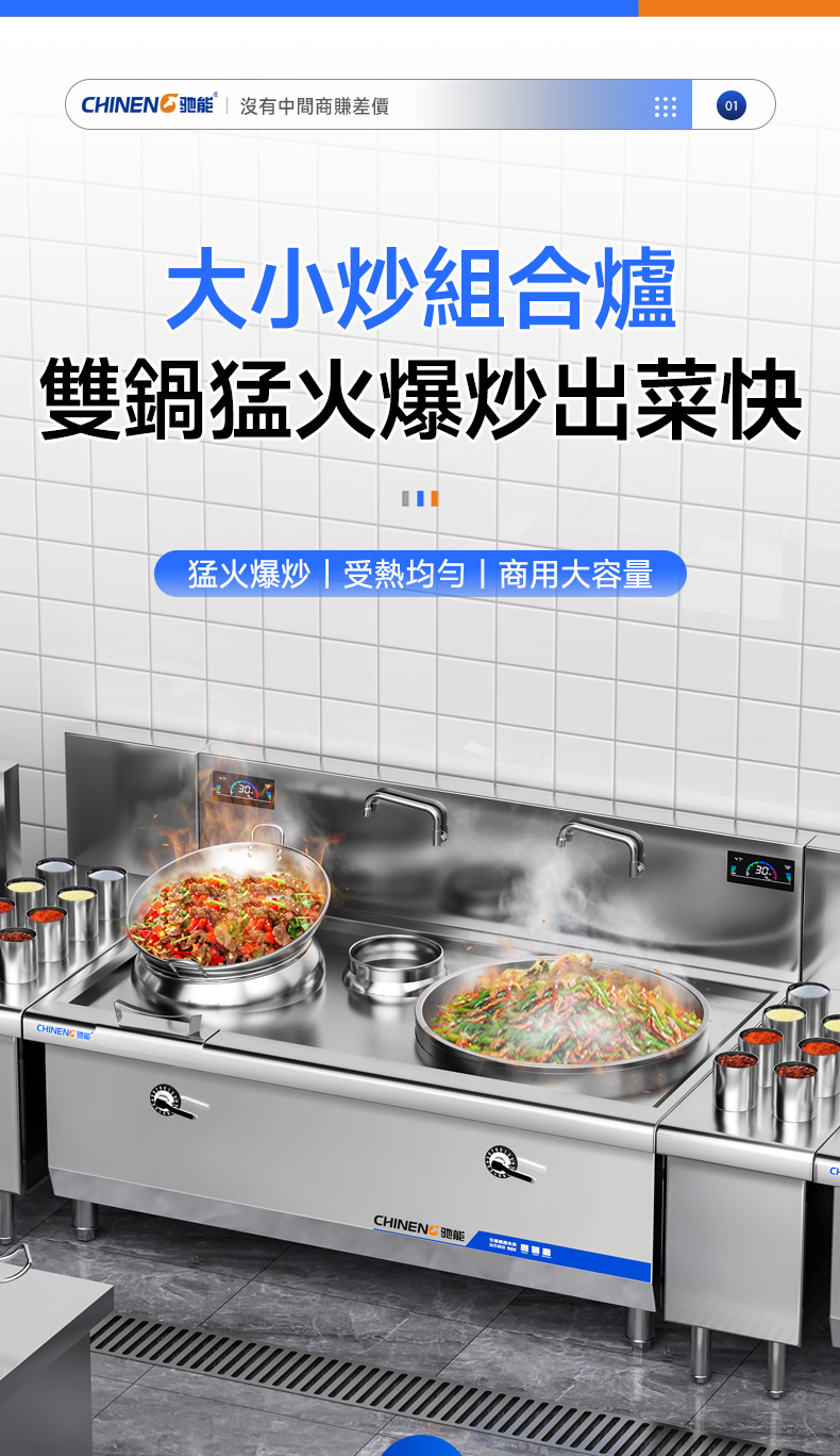 高效節能:馳能商用電磁大小炒組合爐的熱效率極高,能夠迅速加熱食材,同時減少能源消耗。與傳統燃氣或燃油爐竈相比,電磁爐竈能夠節省大量的能源成本。