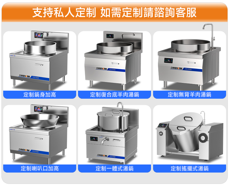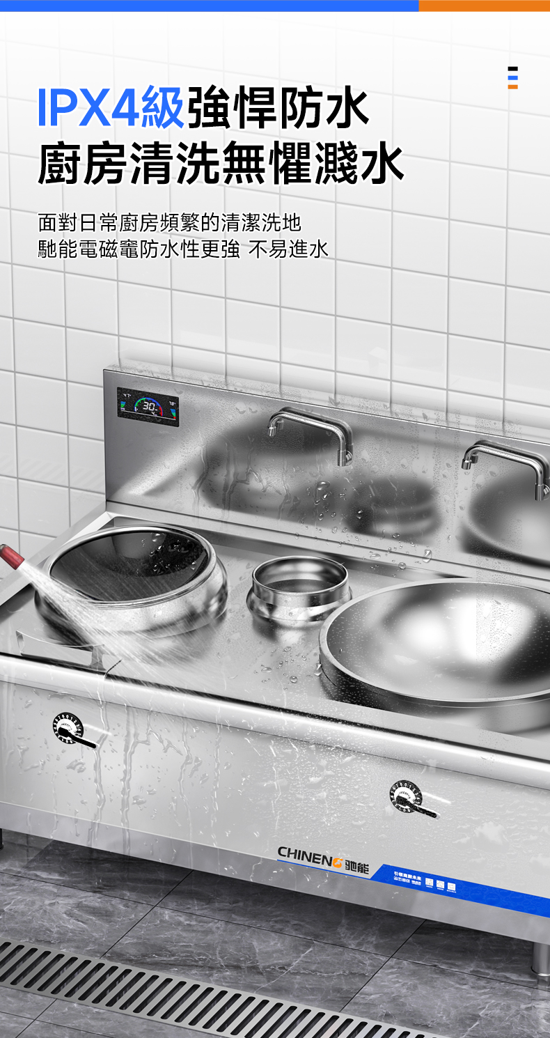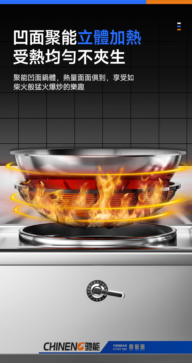 易於清潔和維護:馳能商用電磁大小炒組合爐的表面通常採用易於清潔的材料制成,使得清潔工作變得簡單快捷。同時,它的內部結構也相對簡單,易於維護和保養。